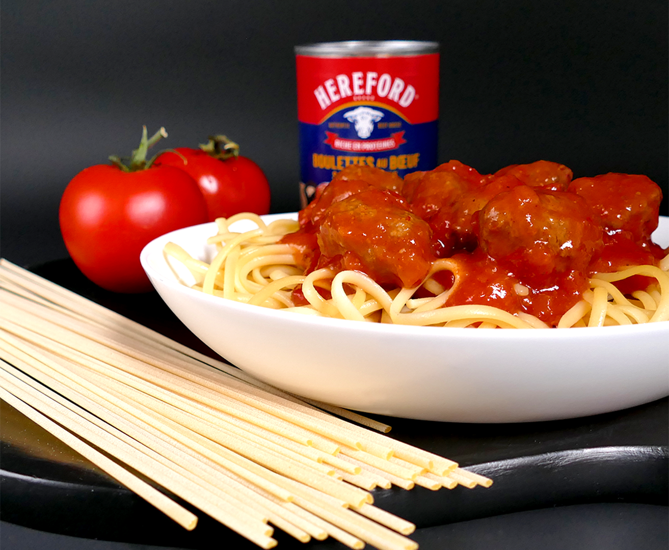 - Une boîte de boulettes au bœuf sauce tomate Hereford