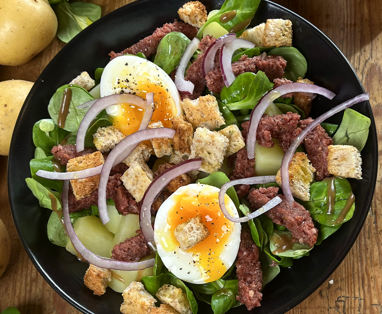 - Puis composez votre salade en disposant les morceaux de pomme de terre, les croutons, les cubes de Corned-Beef et les œufs ouverts en deux.